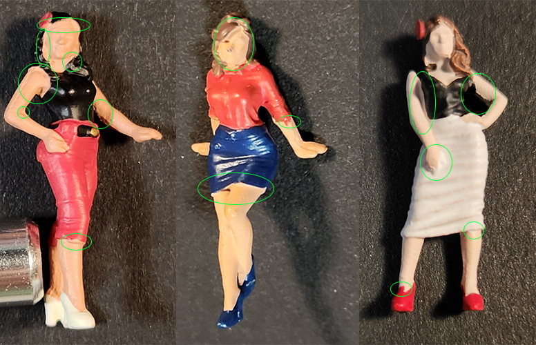 I don’t want to have to adjust my figure placement in photographs to hide the errors. Also, it looks like an enamel paint was used on the figures. They are particularly shiny and reflect a lot of light. Also, there’s a lot of nice detail in the cloth folds on the models. The existing paint job doesn’t draw attention to those details. In the above photo, looking at the underside of the arms on the first and third figures, there is a noticeable seam line that needs to be cleaned up as well.