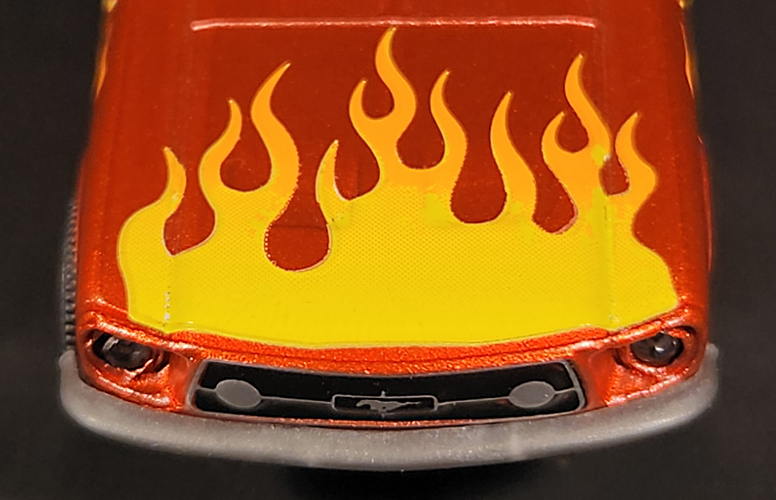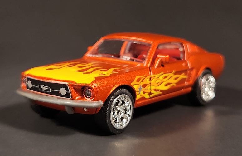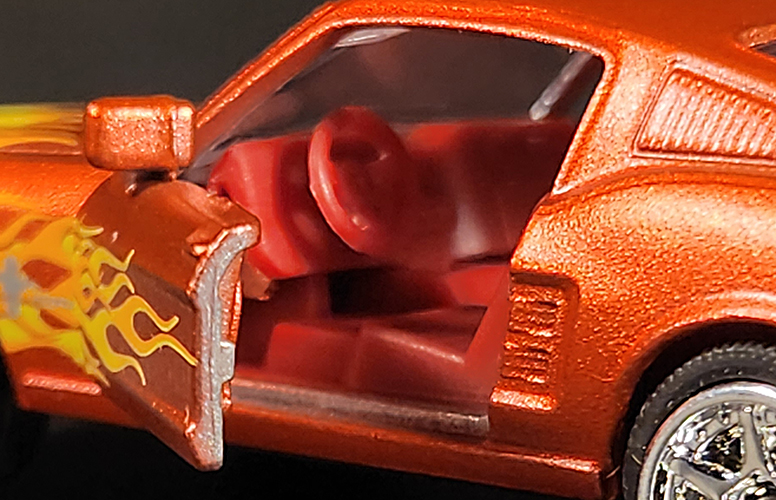 The Fastback was a great addition to my collection, but there were a few flaws on the grille, which can be seen in the slideshow below. The orange flake paint really sets off the yellow and orange flames tampo on the hood and sides of the car. The model has two working doors that show off a detailed interior when opened.
