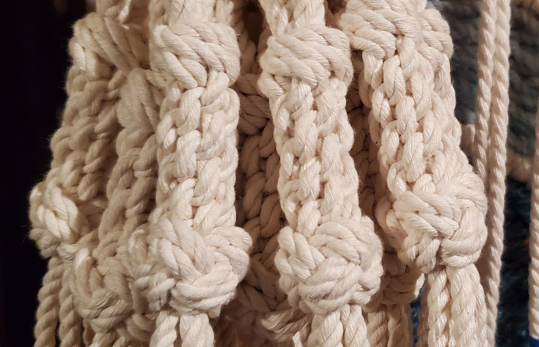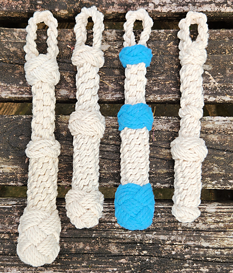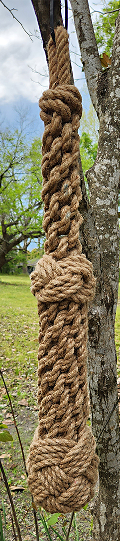 I suppose the thing that fascinates me is the pure simplicity of the purpose of the bell rope and the near infinite possibilities in the way the bell rope can be tied. This page is a collection of photos of bell ropes I’ve tied over the years. The pieces range from pocket-sized keyrings to a 36-inch bell rope made from 1/2-inch sisal rope.